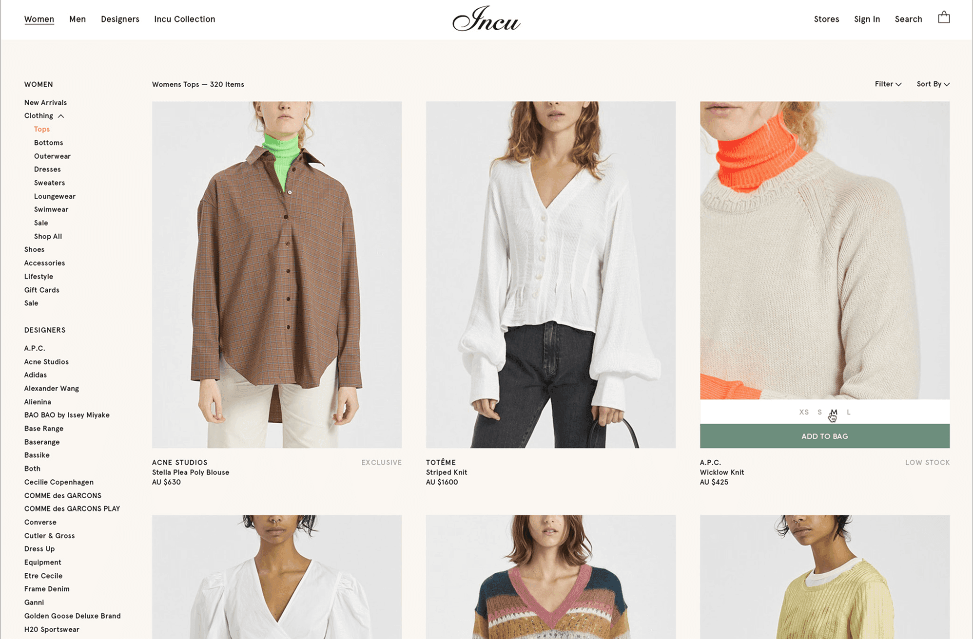 Incu is celebrated for its curated fashion offering and elevated in-store experience. While Head of Design at Holiday, I led the project to translate that same sensibility into the digital space. I focused on creating a refined, intuitive e-commerce experience that mirrored the brand’s understated luxury and commitment to service. The design system emphasised clarity and ease - a calm, tactile shopping environment where product imagery, fabric detail, and thoughtful navigation took centre stage.